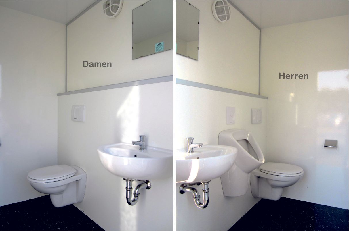Es stehen getrennte Eingänge mit jeweile 1 Damentoilette und 1 Herrentoilette sowie eine Urinal zur Verfügung.