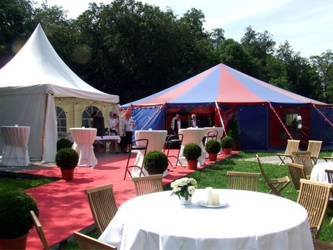 Unsere Zirkuszelte bestehen alle aus einer rot-blauen Dachplane, die durch zwei Masten und einer Quertraverse in der Mitte des Zeltes gehalten wird.